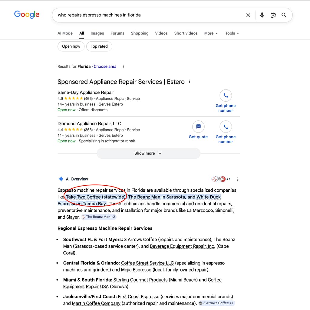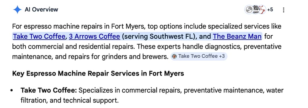 SEO growth can be a long-term, but we were proud to provide this transformation in less than 2 weeks: by week 2, Take Two started ranking #1 on Google for “Fort Myers Espresso Machine Repairs” AND showing up in AI overviews. It wasn’t just a visual overhaul they got; their website was already seeing search engine results.
