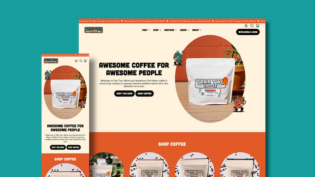 When we connected with Take Two Coffee about their coffee shop web design, they knew it was time for an upgrade. Shopify had served their business well since their launch in 2023, but the content no longer reflected their insane growth as a company. In just 3 years, they’d grown to become one of the best known names in coffee in Southwest Florida (both for their amazing beans, AND for their espresso machine services), and they needed a website to match!