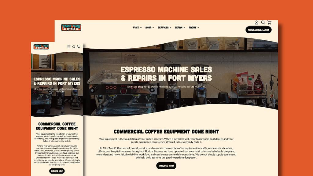 As a Fort Myers web design agency specializing in SEO, we know the importance of showing up on Google searches. We ensured Take Two’s local SEO was prioritized so that when Florida coffee enthusiasts and businesses search for repairs or premium beans, Take Two would come up at the top of their searches.